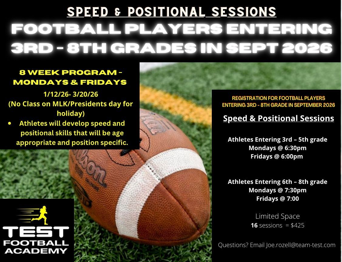 TEST Football Academy is hosting a Youth Positional Training Program for the 2026 Off Season. Information for this is provided in the flyer.